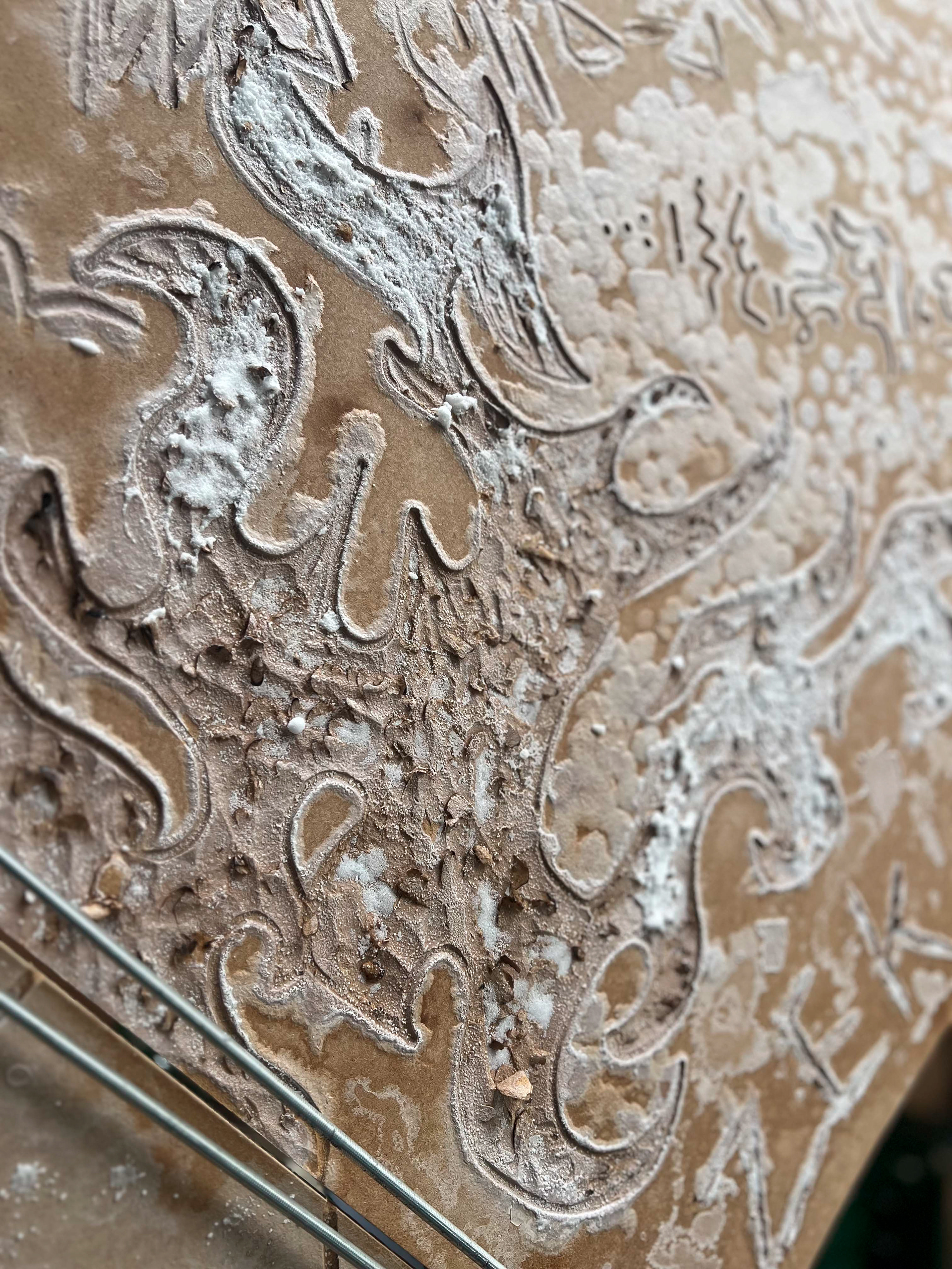 The gate consists of two visually articulated façade surfaces. The frontal design, created by Dávid Koronczi, is covered with a collection of fictional salty tags, graffiti, and inscriptions. Some are understandable, others remain cryptic. Their salty materiality suggests and reminds us of the thin boundary between life and non-life, between the organic and the inorganic world. The salt crystals on the surface of the reliefs subtly shift each day—absorbing the night’s humidity and hardening again in the daytime. They move, they draw, they sculpt.