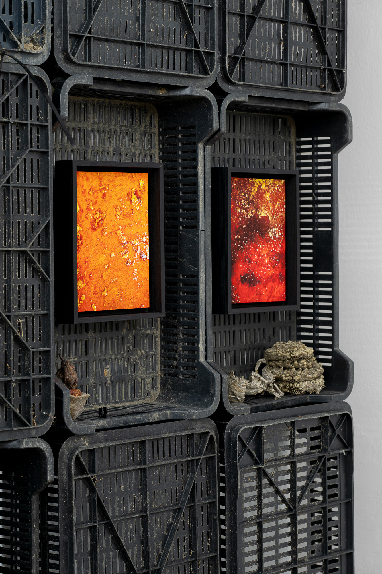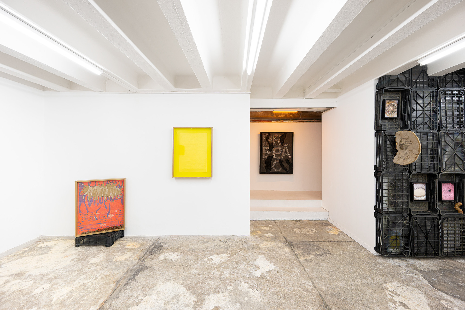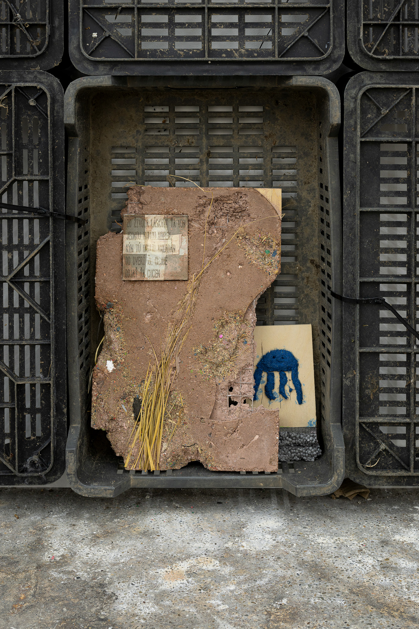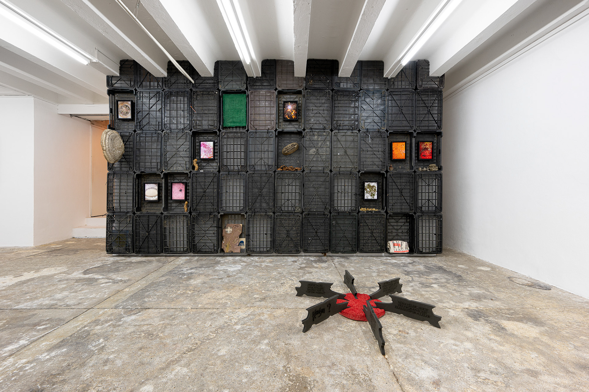 Questions of circulation, value, and standardization surface through a distinctly glocal visual language. References to graphic design, urban visual culture, graffiti, and hip hop are filtered through post-digital sensibilities and folded back into a place-bound material practice made from natural materials, found objects, and everyday residues. Strategies associated with pop art – irony, repetition, over-identification – are used to expose the mechanisms through which desire, consumption, and visibility circulate. A recurring element is the plastic vegetable crate, a standardized and modular object that evokes seriality, efficiency, and modernist universality. These logics reappear in grid structures across the exhibition, where hand-drawn processes align with digital tools and global systems of circulation, resonating with Keller Easterling’s analysis of planetary infrastructure space in Extrastatecraft.