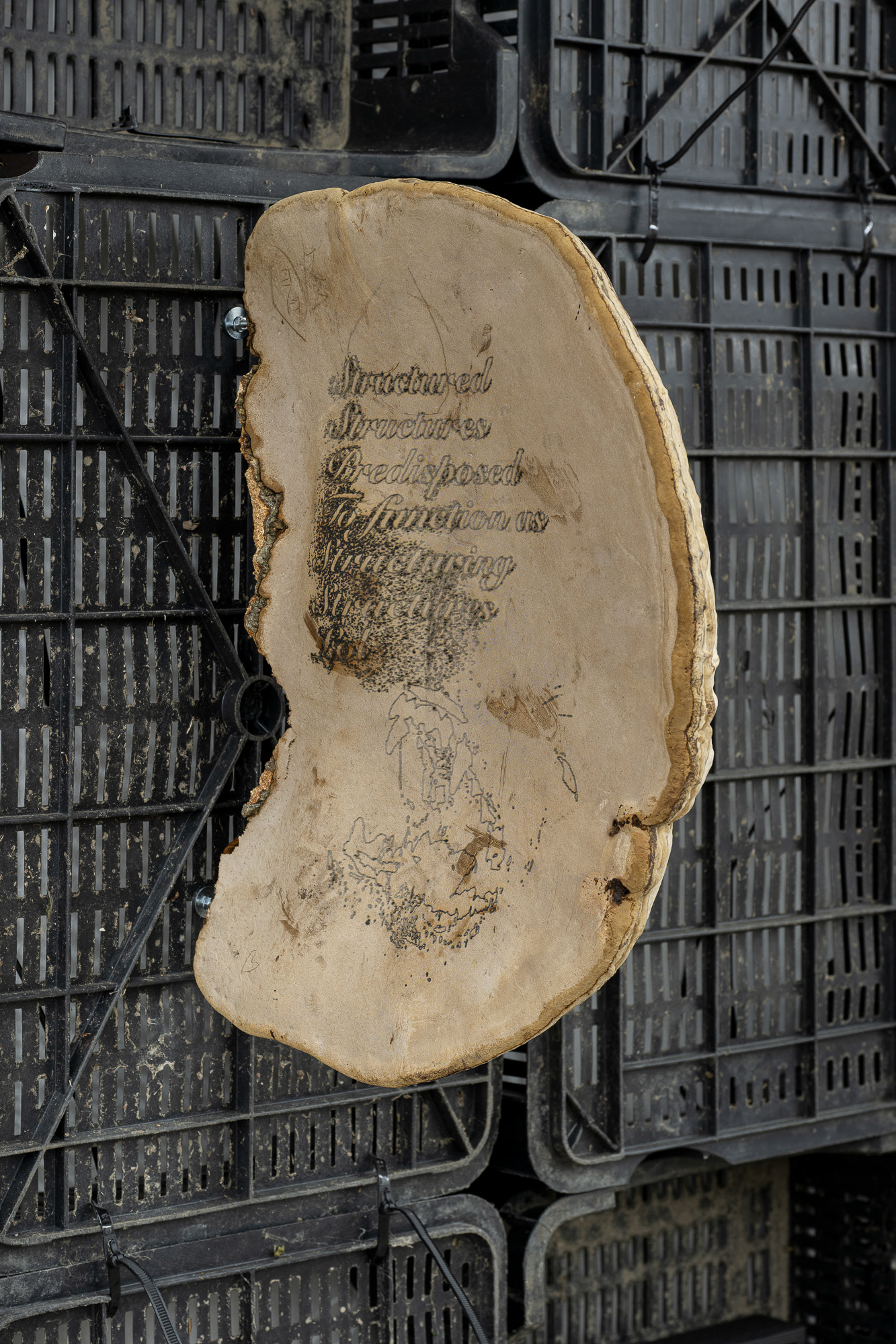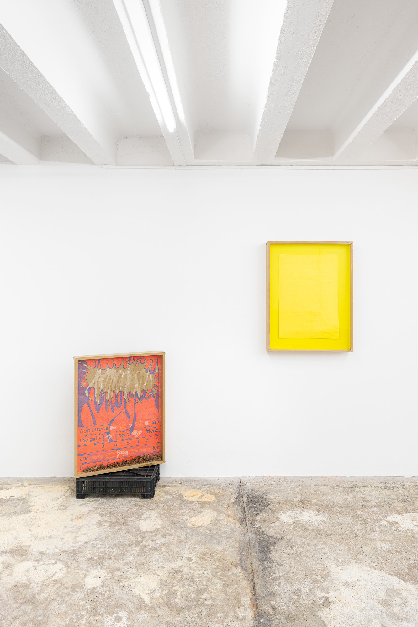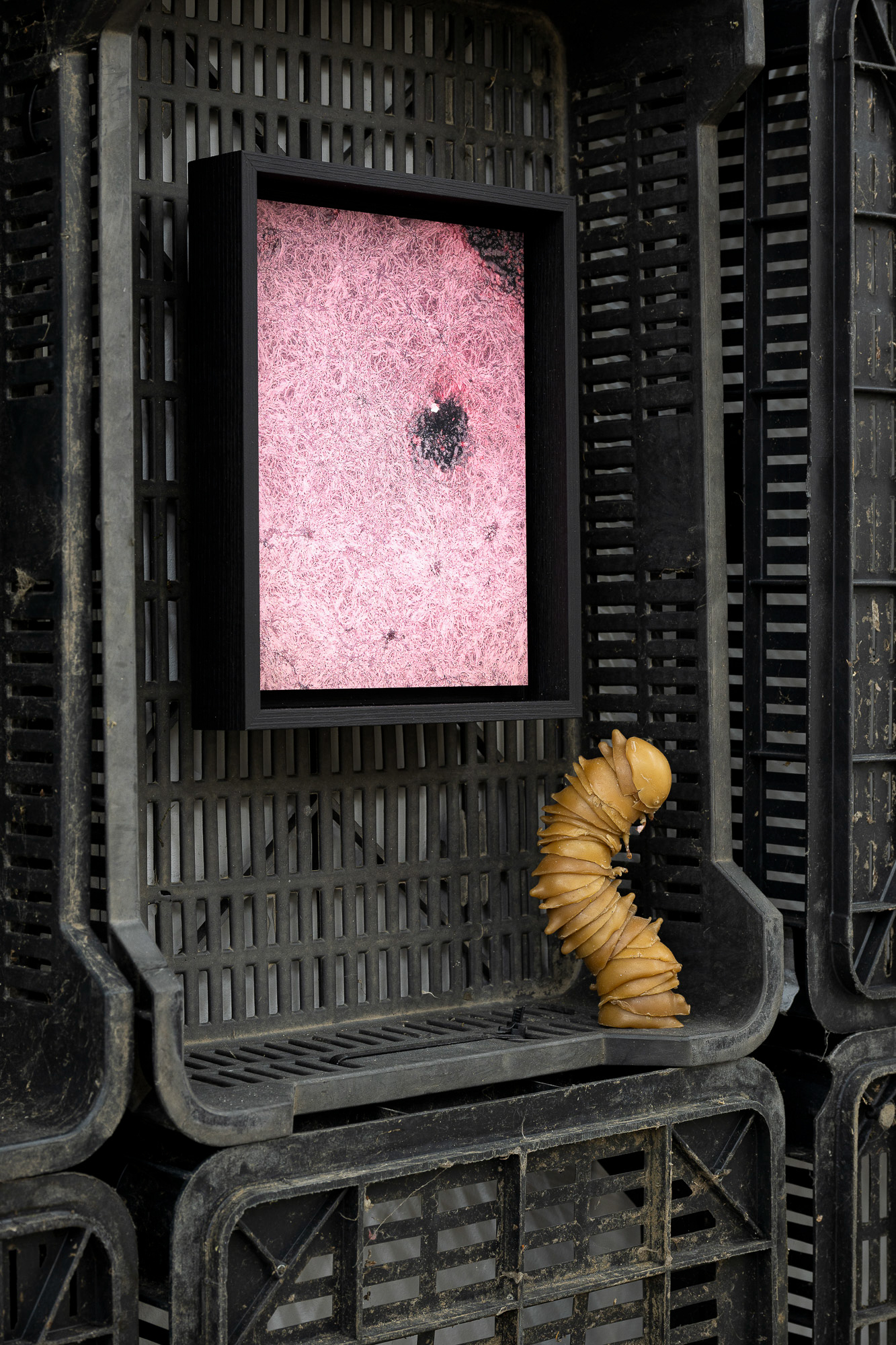 Questions of circulation, value, and standardization surface through a distinctly glocal visual language. References to graphic design, urban visual culture, graffiti, and hip hop are filtered through post-digital sensibilities and folded back into a place-bound material practice made from natural materials, found objects, and everyday residues. Strategies associated with pop art – irony, repetition, over-identification – are used to expose the mechanisms through which desire, consumption, and visibility circulate. A recurring element is the plastic vegetable crate, a standardized and modular object that evokes seriality, efficiency, and modernist universality. These logics reappear in grid structures across the exhibition, where hand-drawn processes align with digital tools and global systems of circulation, resonating with Keller Easterling’s analysis of planetary infrastructure space in Extrastatecraft.