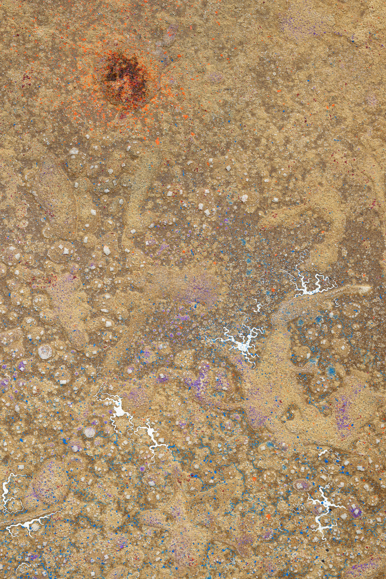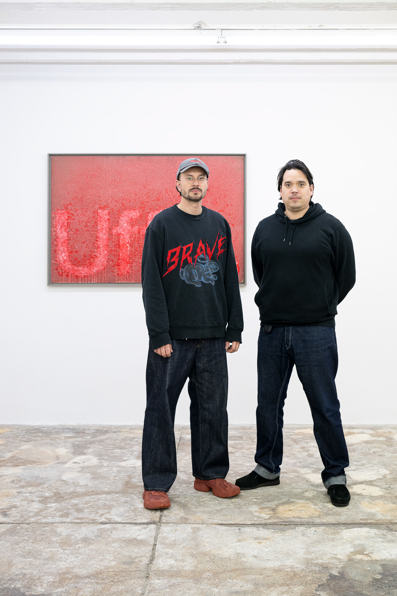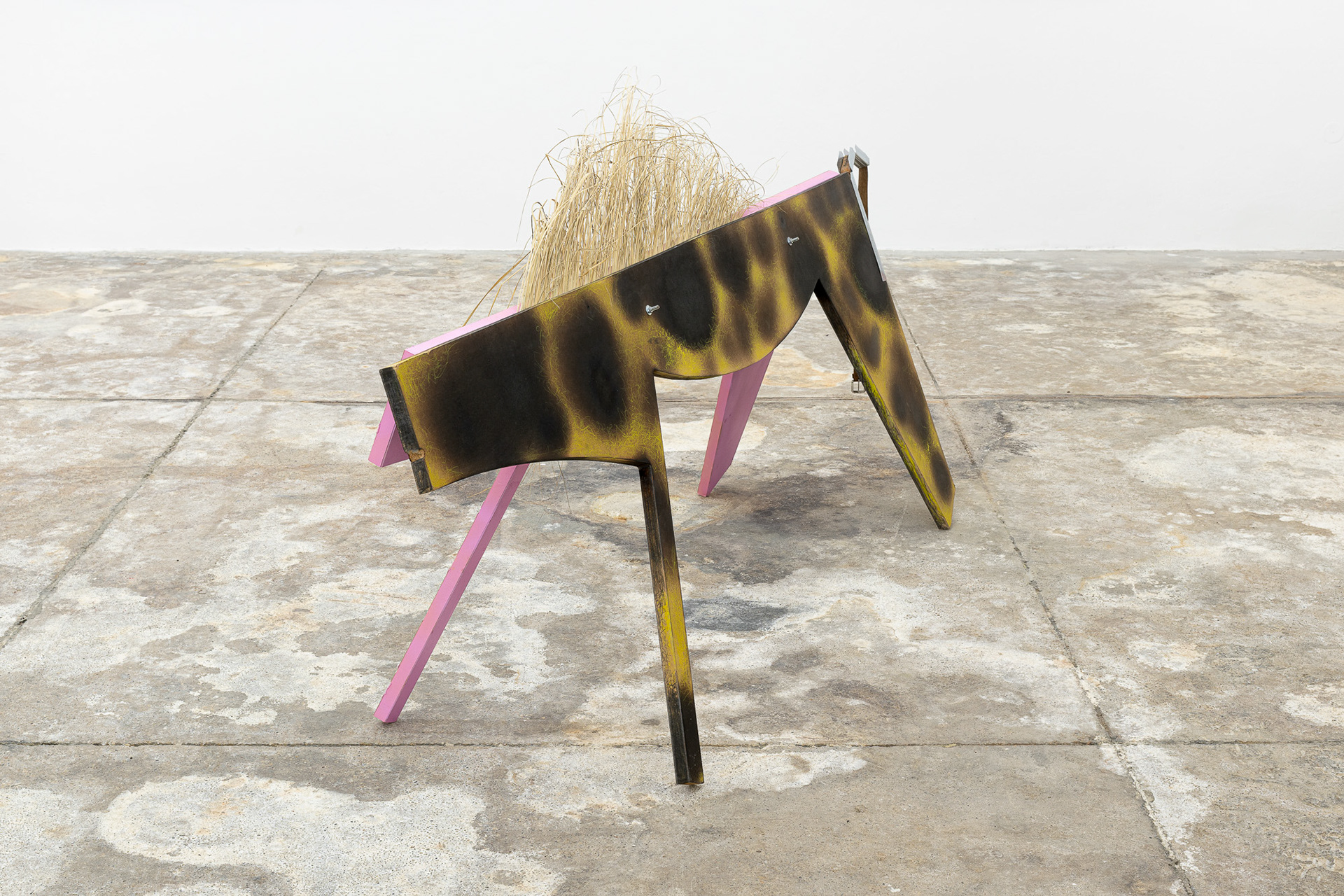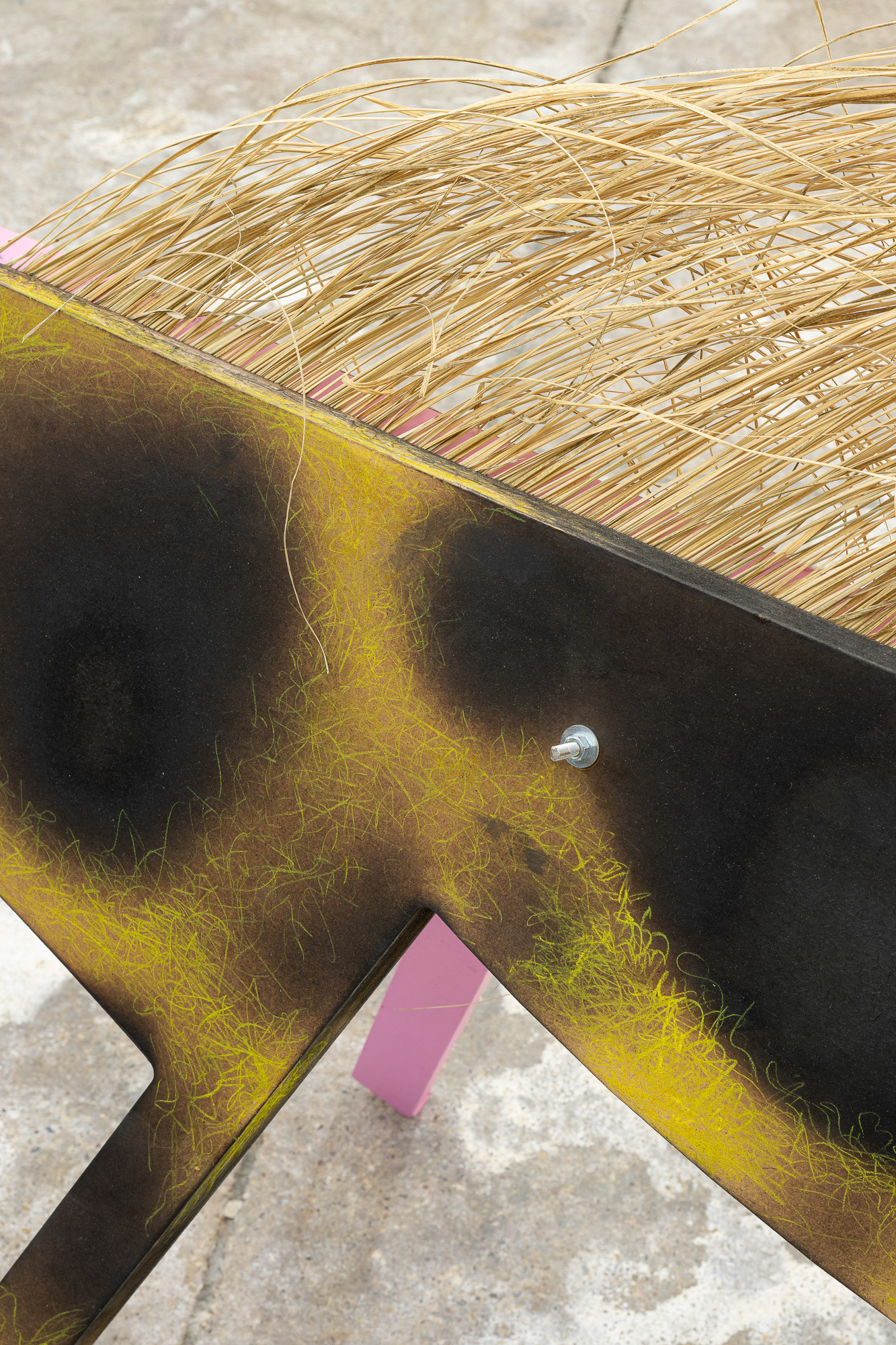 Questions of circulation, value, and standardization surface through a distinctly glocal visual language. References to graphic design, urban visual culture, graffiti, and hip hop are filtered through post-digital sensibilities and folded back into a place-bound material practice made from natural materials, found objects, and everyday residues. Strategies associated with pop art – irony, repetition, over-identification – are used to expose the mechanisms through which desire, consumption, and visibility circulate. A recurring element is the plastic vegetable crate, a standardized and modular object that evokes seriality, efficiency, and modernist universality. These logics reappear in grid structures across the exhibition, where hand-drawn processes align with digital tools and global systems of circulation, resonating with Keller Easterling’s analysis of planetary infrastructure space in Extrastatecraft.
