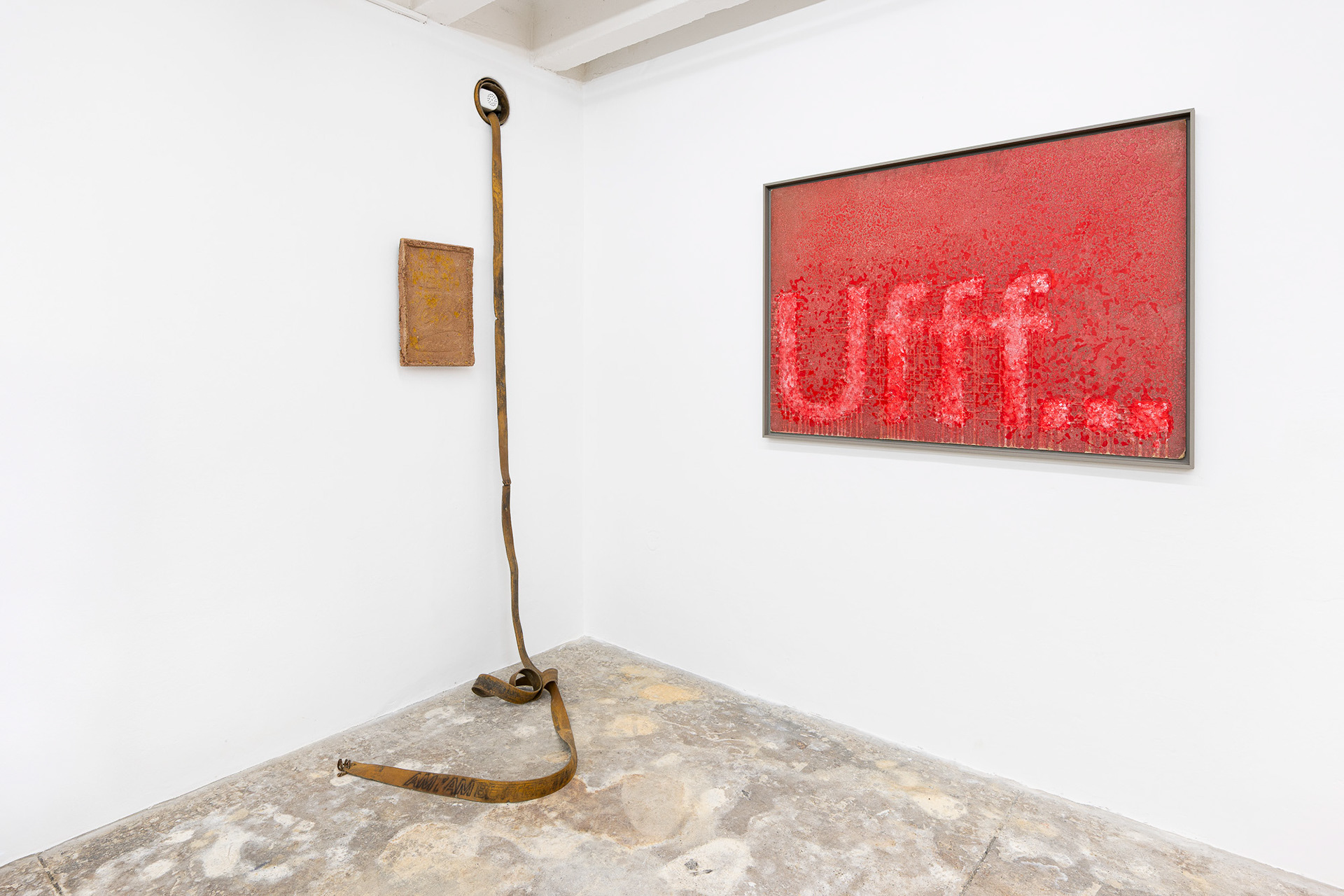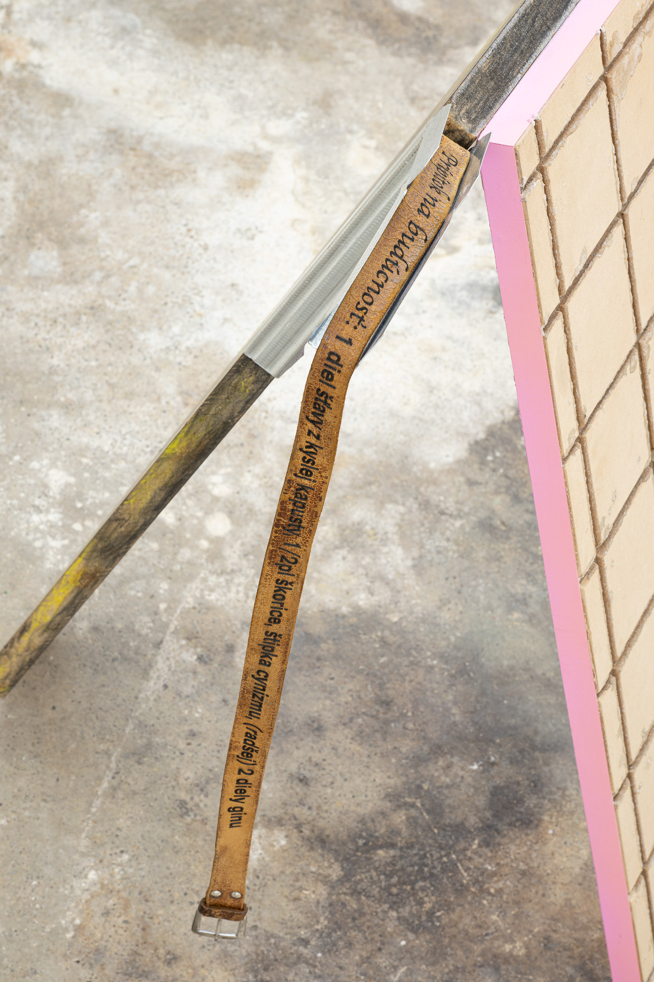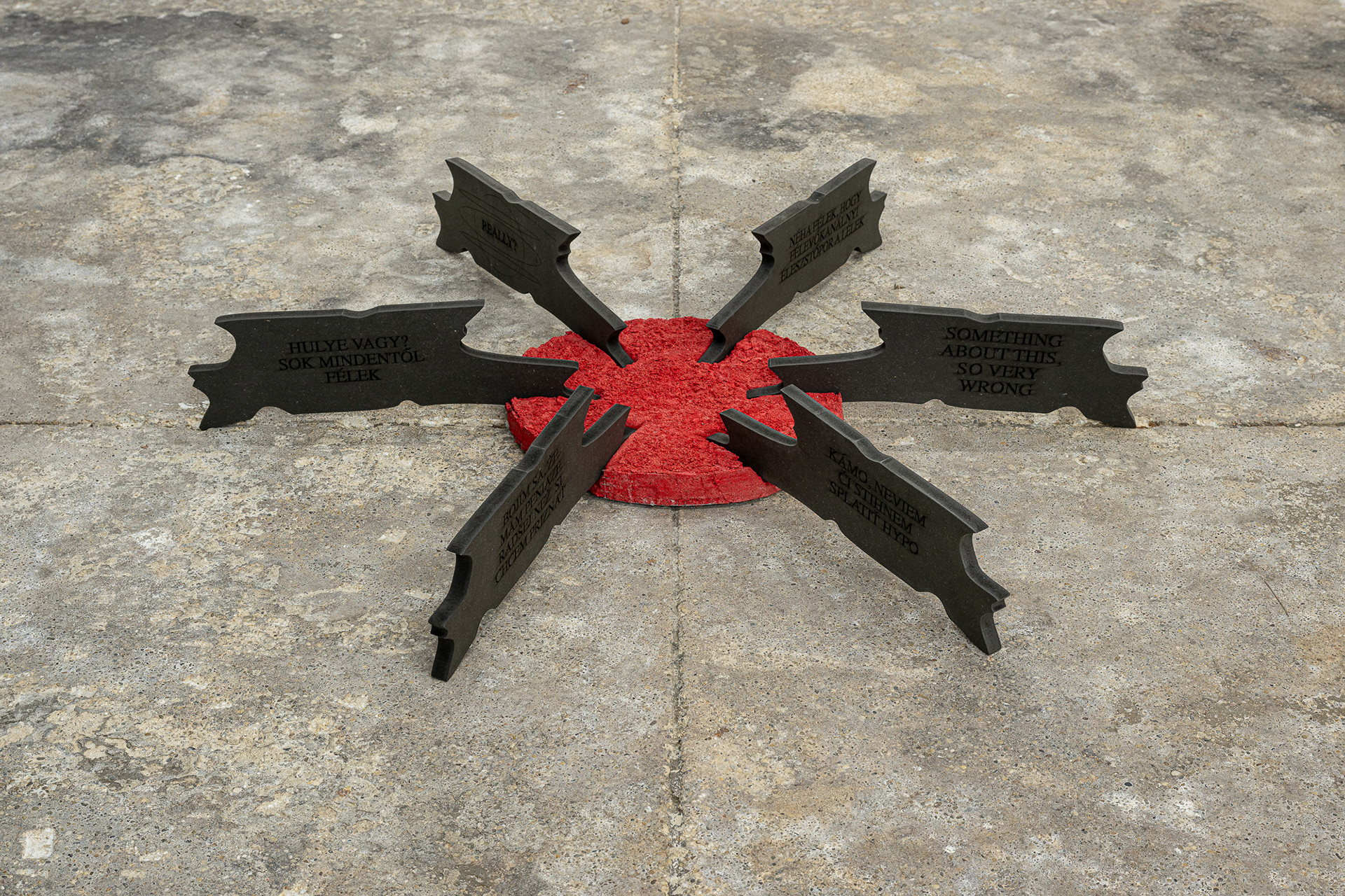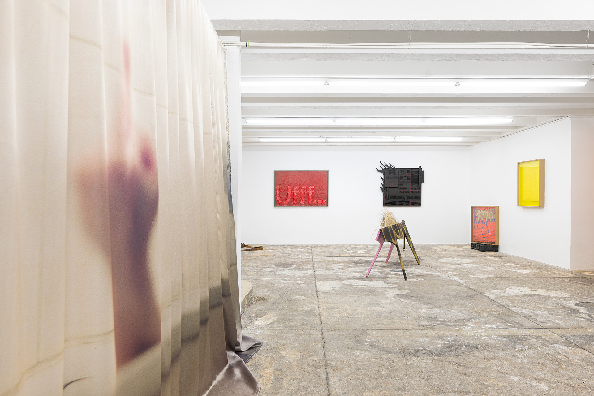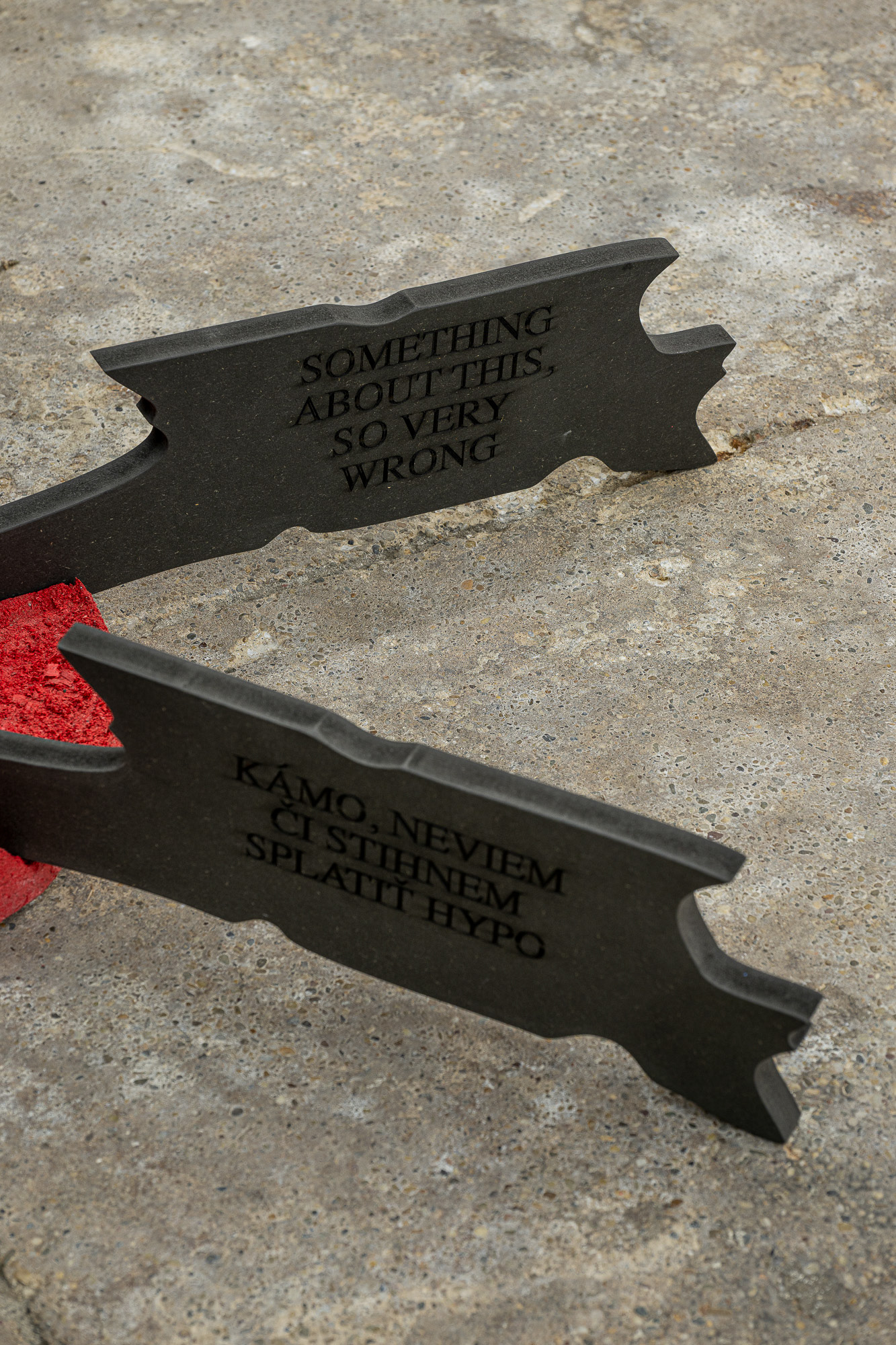 Language enters the exhibition as something spatial and alive. Text appears in visual registers associated with graffiti, graphic design, and urban vernaculars, carrying expressions such as Ufff…, prepáč, or fuck you. These phrases read less as messages than as gestures, in the spirit of the late Wittgenstein’s philosophy of language, which later served as a foundation for John L. Austin’s Speech Act Theory and, in art-historical terms, finds its context in Horst Bredekamp’s concept of Bildakt, or Image Act Theory. In Koronczi’s art, these words often function as logos, or as brief visual and linguistic acts that interrupt, assert presence, and register affect. Text and image work directly on their surroundings, loosening authorship and meaning while foregrounding friction, immediacy, and position.